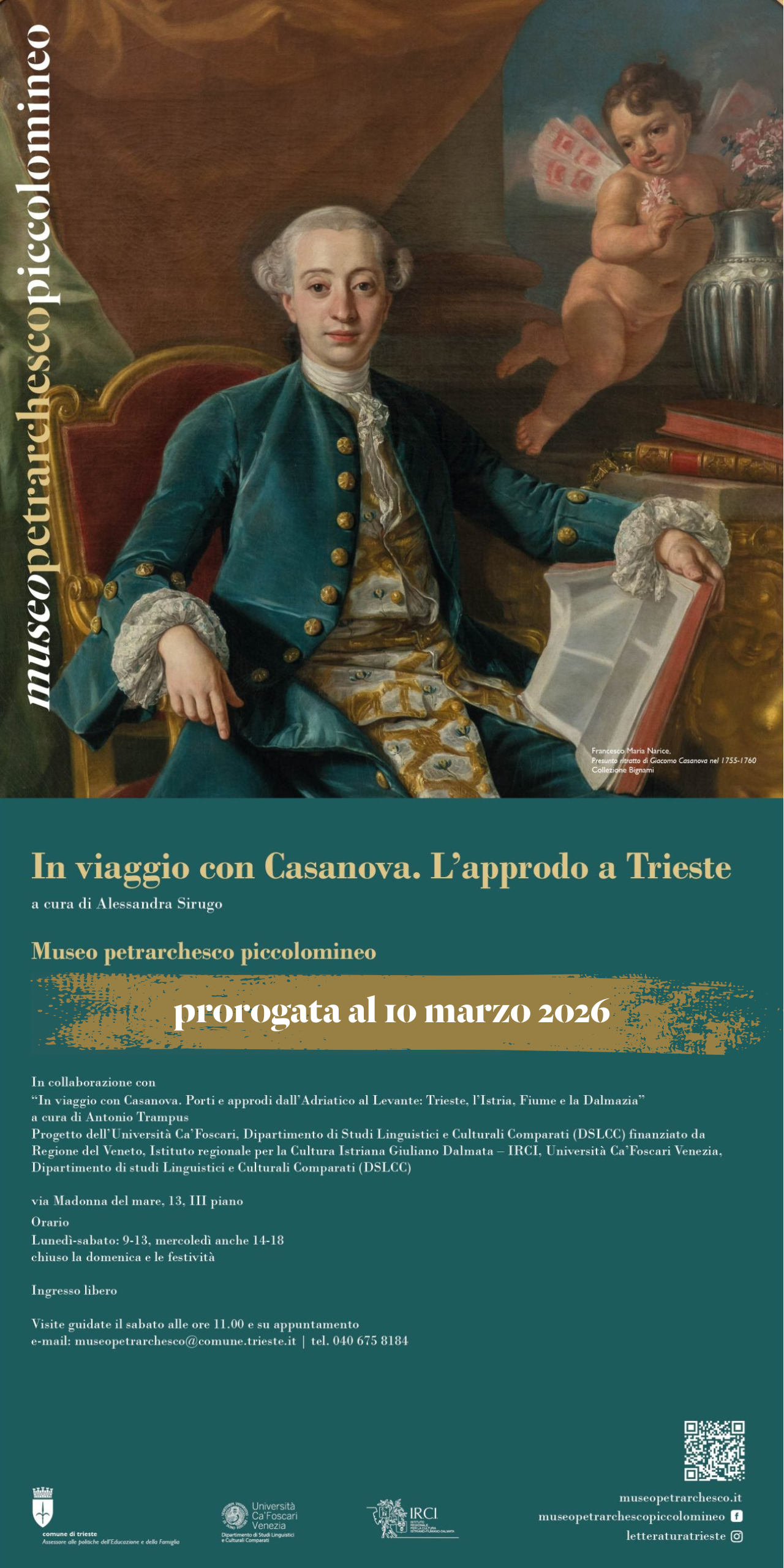 Nel 2025, anno in cui ricorrono i 300 anni dalla nascita di Casanova (1725-1798), il Civico Museo petrarchesco piccolomineo ricorda il periodo in cui lo scrittore ha vissuto a Trieste, dal 15 novembre 1772 al 14 settembre 1774, con la mostra “In viaggio con Casanova. L’approdo a Trieste” a cura di Alessandra Sirugo.
